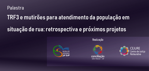 A Divisão da Escola de Formação e Aperfeiçoamento de Servidores - DIES, em parceria com a Divisão de Apoio à Conciliação de São Paulo - CECON, e o Centro de Justiça Restaurativa São Paulo - CEJURE, convida a todas e todos para a Palestra “TRF3 e Mutirões para atendimento da população em situação de rua: retrospectiva e próximos projetos”, no dia 27/02 (quinta-feira), às 18h (horário de Brasília).