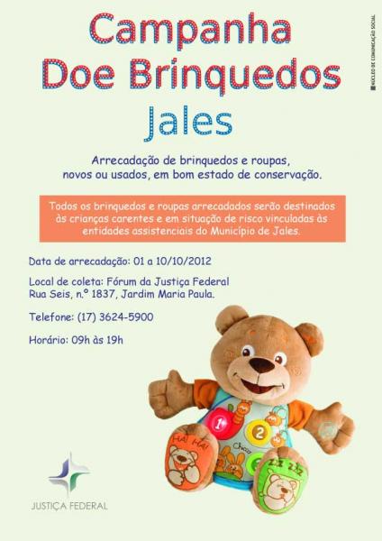 Em comemoração ao Dia das Crianças, que acontece no dia 12/10, o Fórum Federal em Jales/SP está promovendo, com o apoio da OAB, a “Campanha Doe Brinquedos”.