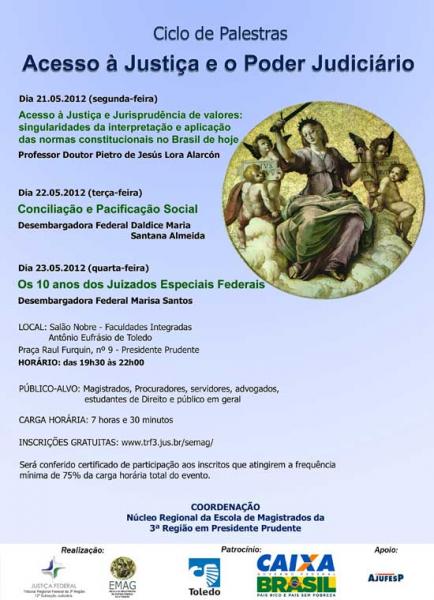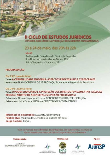Dois ciclos jurídicos voltados para magistrados, servidores e público em geral serão realizados na próxima semana no interior paulista. De 21 a 23/5, Presidente Prudente promoverá uma série de palestras abordando o tema “Acesso à Justiça e o Poder Judiciário”. Na cidade de Sorocaba, “O Poder Judiciário e a Proteção dos Direitos Fundamentais” será debatido nos dias 23 e 24/5 pelos palestrantes convidados.