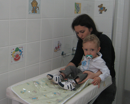 Decorado com desenhos para deixar o ambiente mais agradável, o fraldário foi aprovado pelos usuários do Fórum. Rosiane, mãe do bebê Miguel, reconheceu a dificuldade em trocar fraldas quando está fora de sua casa. (GGP/FRC)