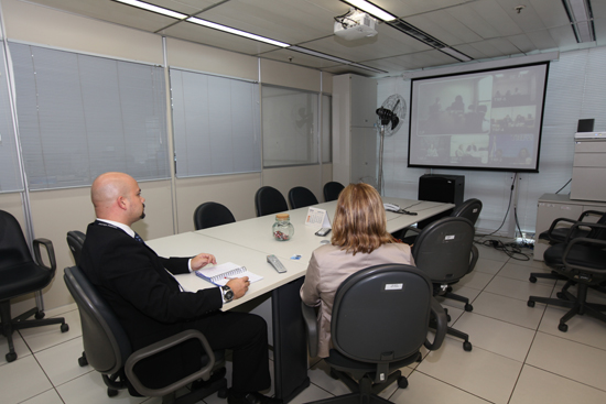 Os servidores Hélio Cesário Martins Jr. e Elizabeth Branco Pedro, representantes da 3ª Região, participaram da reunião com transmissão por videoconferência na Secretaria de Tecnologia da Informação do TRF3. (RAN)