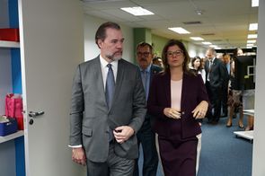 O presidente do Supremo Tribunal Federal (STF), ministro Dias Toffoli, juntamente com o corregedor nacional de Justiça, ministro Humberto Martins, visitaram, no dia 2/12, o Laboratório de Inovação da Justiça Federal de São Paulo (iJuspLab). Os ministros foram recebidos pela presidente do TRF3, desembargadora Therezinha Cazerta, e pela juíza diretora do Foro, Luciana Ortiz.