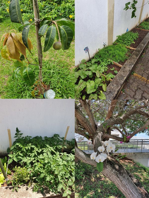 Para o pomar, foram plantadas mudas de manga, pitanga, maracujá, jabuticaba, romã, laranja, goiaba e amora, que são irrigadas por técnica de gotejamento. Na horta há rúcula, alface, tomates cereja e italiano, alecrim, hortelã, beterraba, cenoura, manjericão, pimenta biquinho, couve, cebolinha e salsinha.