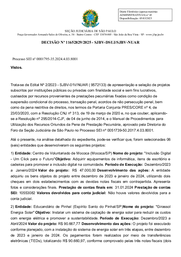 Decisão Homologatória da prestação de contas apresentada pelas 06 entidades contempladas pelo Edital Nº 2/2023 - SJBV-01V/NUAR, que trata da de apresentação e seleção de projetos subscritos por instituições públicas ou privadas com finalidade social e sem fins lucrativos, custeados por recursos provenientes de prestações pecuniárias fixadas como condição de suspensão condicional do processo, transação penal, acordos de não persecução penal, bem como da pena restritiva de direitos.